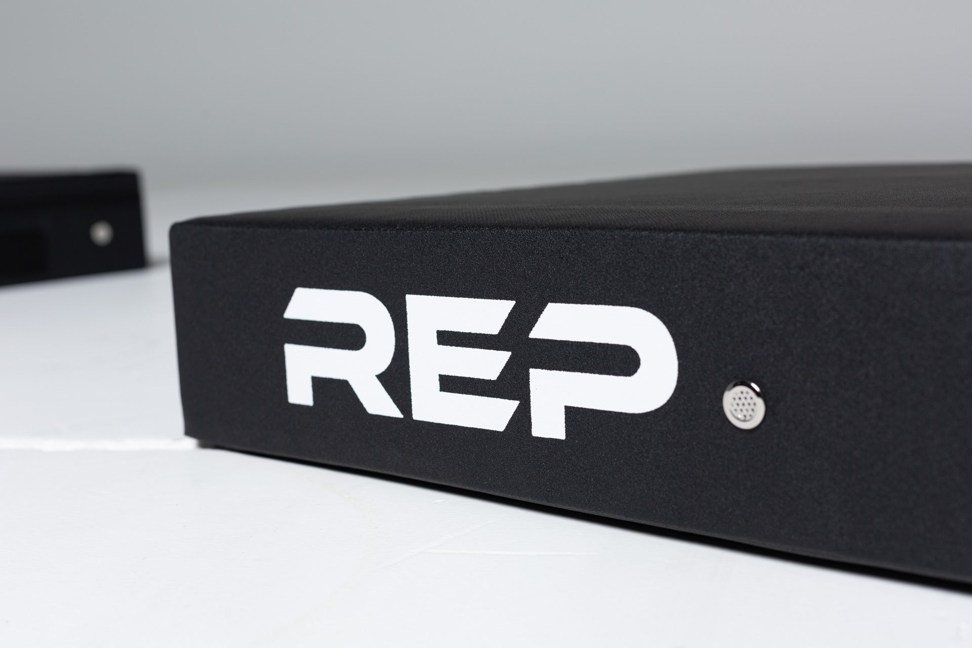 • A barbell loaded with two 45lb REP bumper plates resting on the REP Crash Pad.